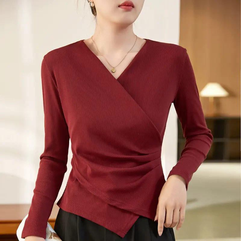 Highly Concerned Chemicals: None Collar Type: V-Neck Pattern Type: Solid Color Length: Regular Decoration: Pleats Sleeve Length: Long Sleeve Material: Cotton Gender: Female Color:Dark-red Size:S-XL..