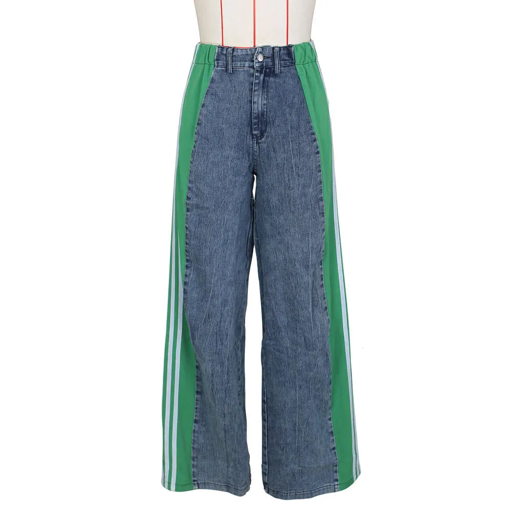 Women Jeans Pants Splicing Stripe Wide Leg Denim Trousers